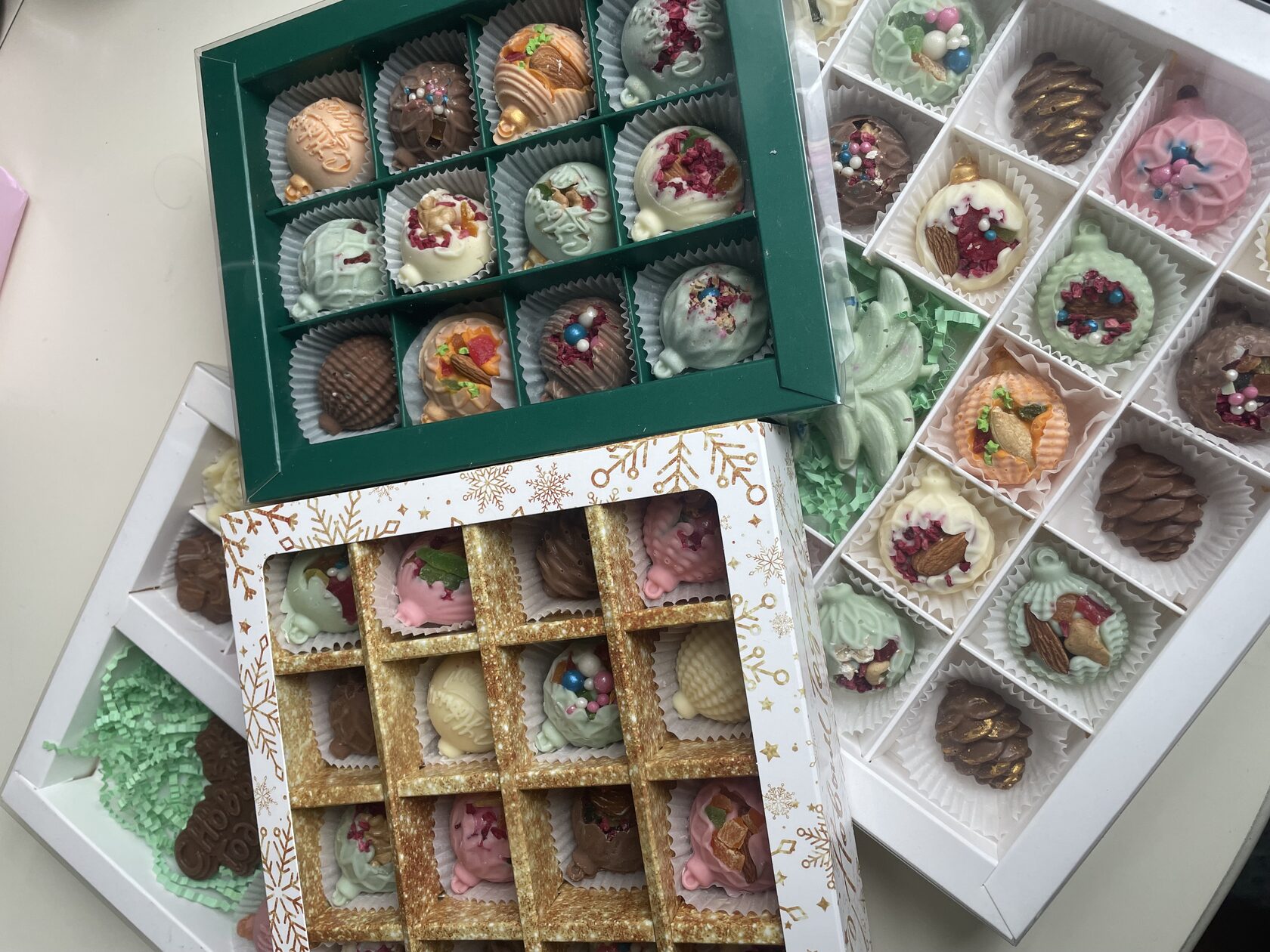 Все изделия ручной работы, выполнены из натурального, бельгийского, премиум шоколада. Новогодние шарики все с наполнением: орехи, сублимированные ягоды, сухофрукты.
